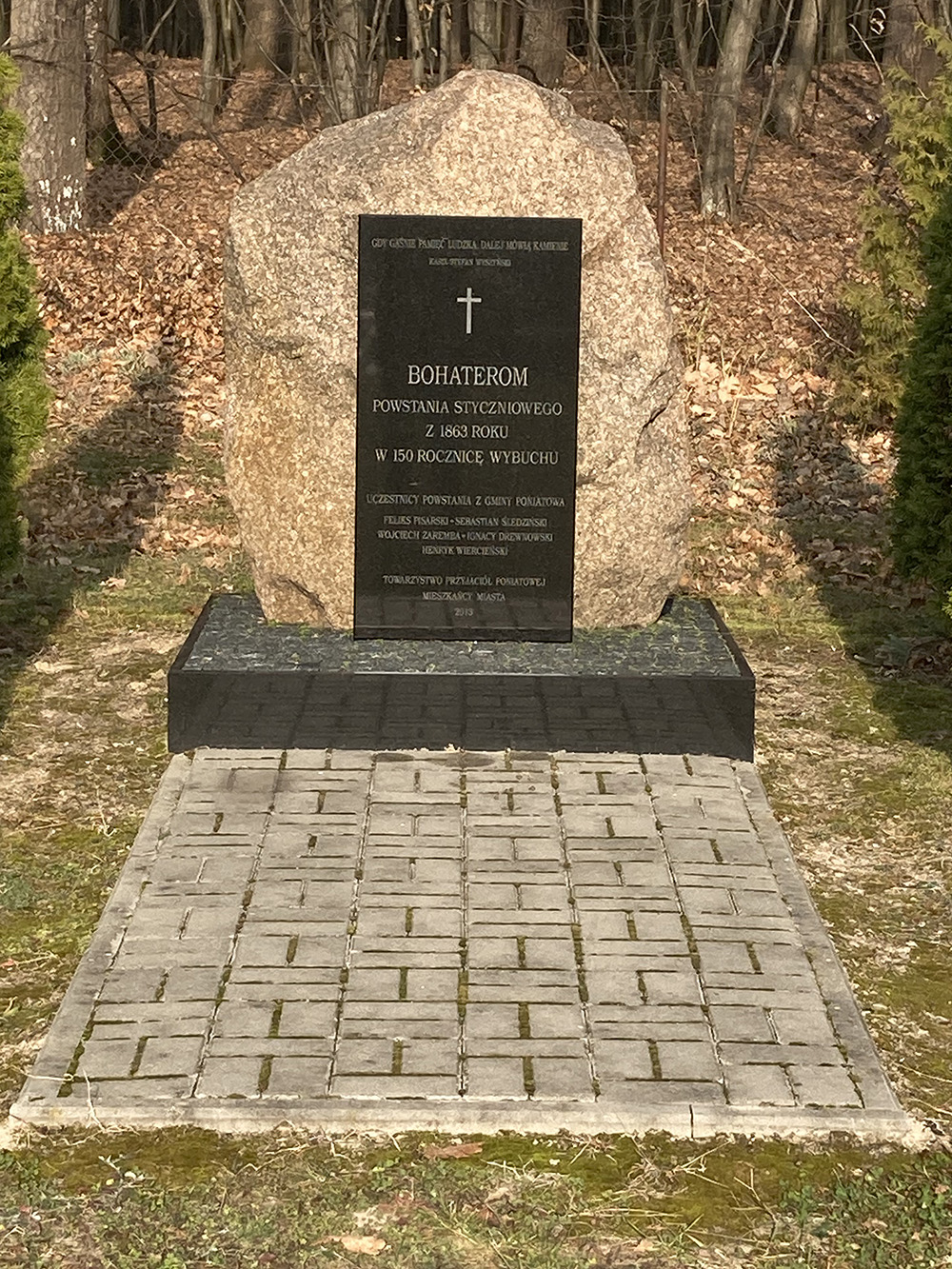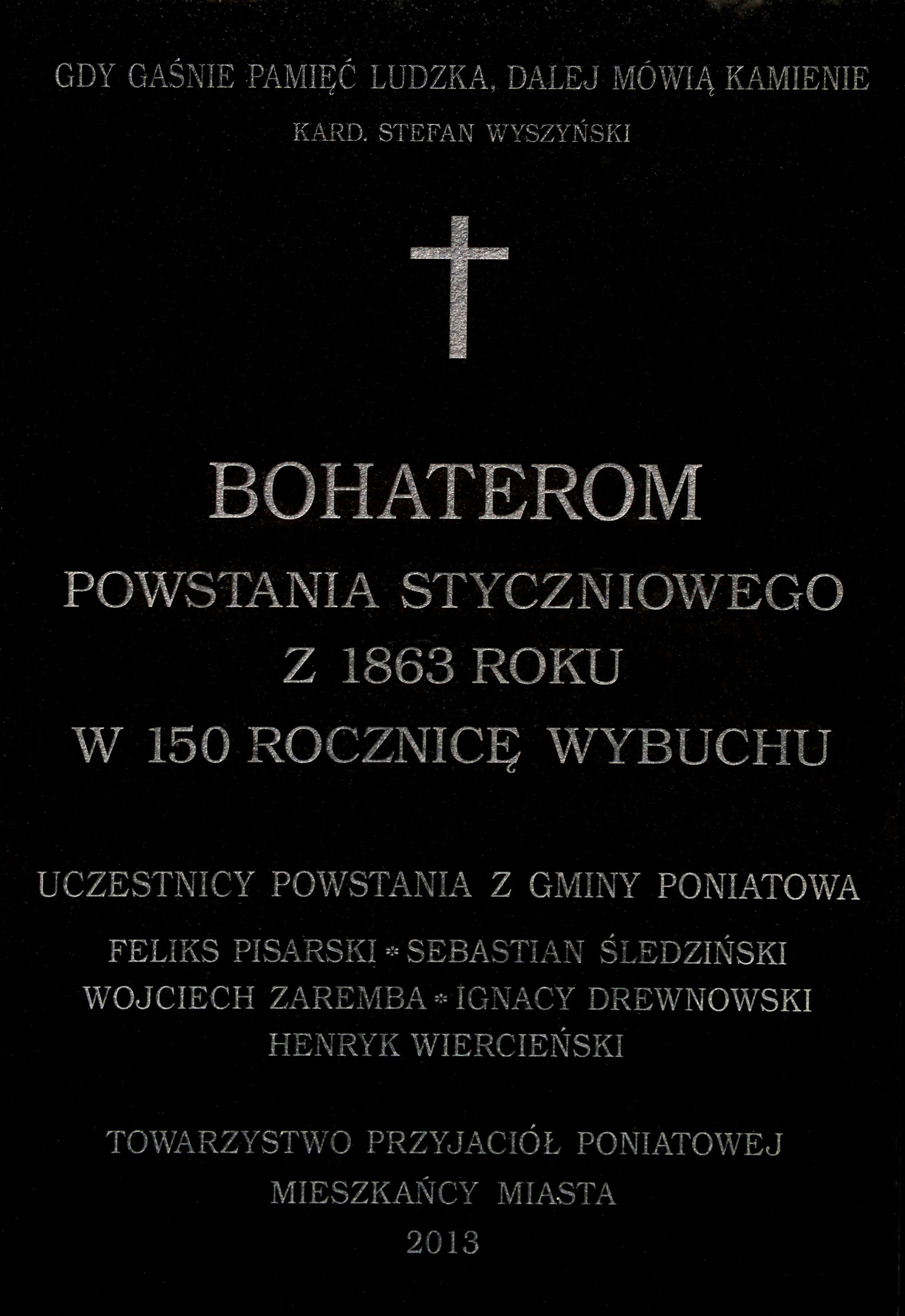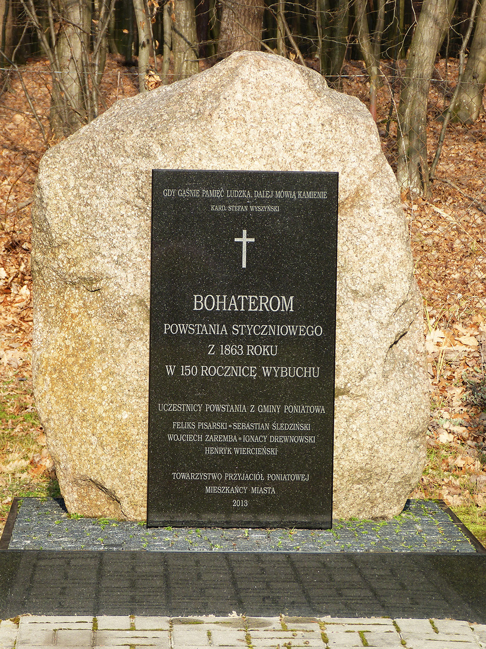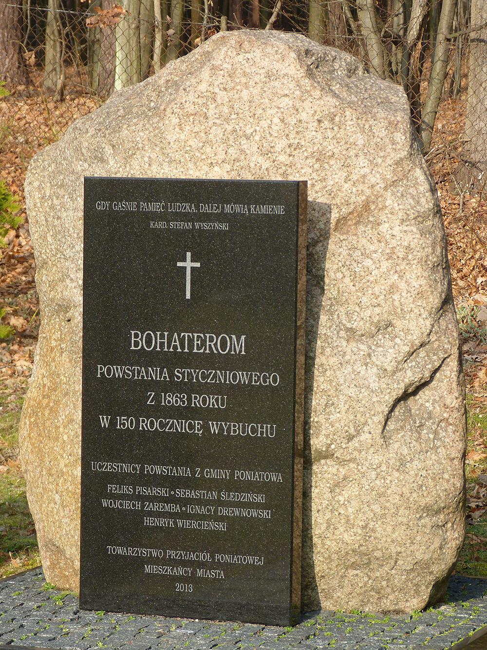 11 listopada 2013 roku odsłonięto pomnik, składający się z polnego głazu i tablicy pamiątkowej, poświęcony osobom z terenów należących obecnie do Gminy Poniatowa, biorącym udział w powstaniu styczniowym (1863–1864). Było to przedsięwzięcie podsumowujące działalność Towarzystwa Przyjaciół Poniatowej związaną z jubileuszowymi obchodami sto pięćdziesiątej rocznicy tego zrywu narodowego. W skład Honorowego Komitetu budowy pomnika wchodzili: Lilla Stefanek – ówczesna Pani Burmistrza Poniatowej, ks. Piotr Krzysztof Petryk – proboszcz parafii pw. Ducha Świętego w Poniatowej, Piotr Adam Kowalski – Prezes Przedsiębiorstwa Gospodarki Komunalnej w Poniatowej, Adam Popiołek – Przewodniczący Związku Kombatantów RP i Byłych Więźniów Politycznych w Poniatowej, Waldemar Kotłowski – przedsiębiorca i Rafał Andrzej Pastwa – Prezes Towarzystwa Przyjaciół Poniatowej.