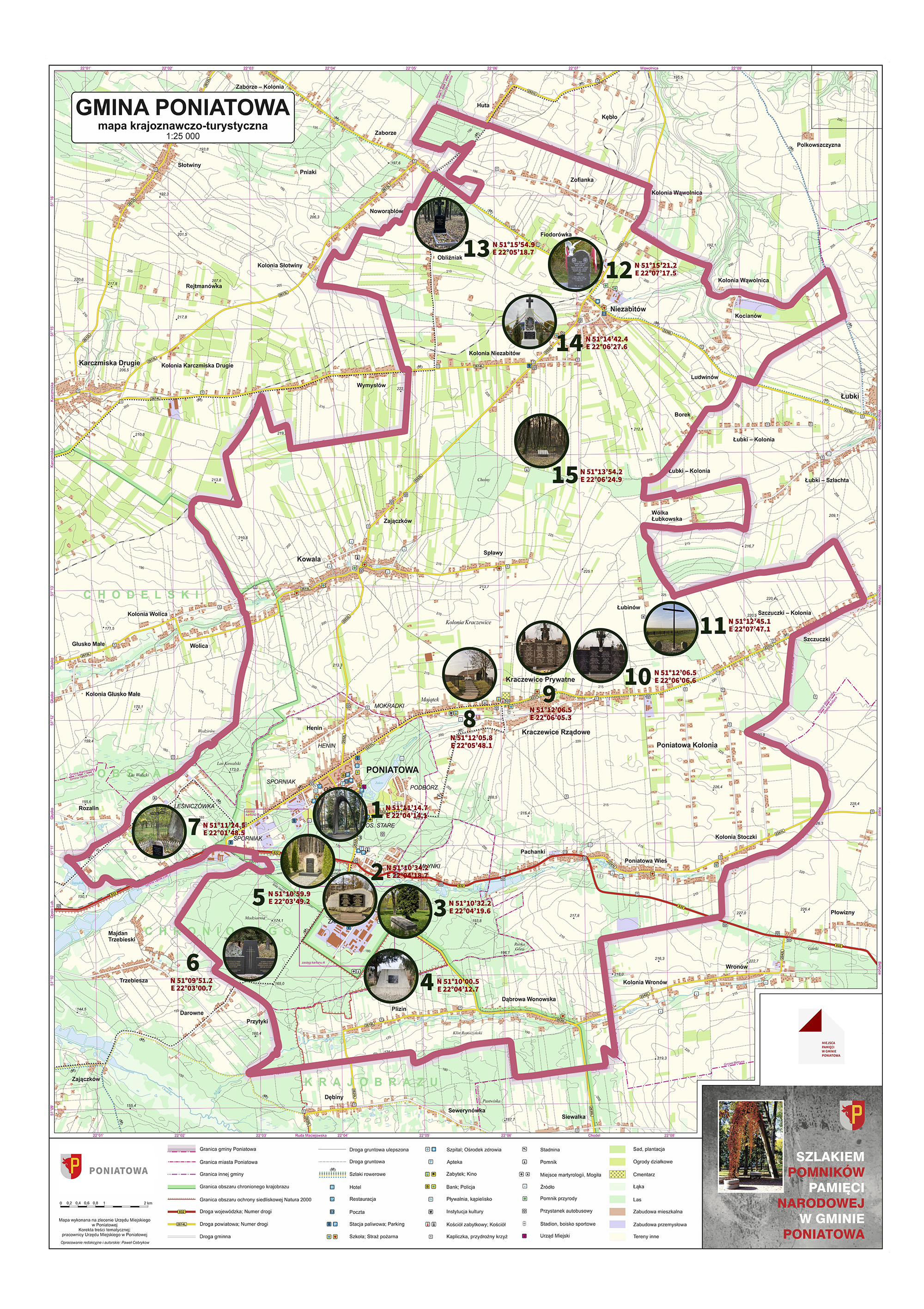 Zapraszamy do zwiedzania miejsc pamięci według naszego przewodnika zatytułowanego Szlakiem pomników pamięci narodowej w Gminie Poniatowa, publikacji dostępnej w całości na kolejnych podstronach tego serwisu [zob.: czytaj więcej]. Można ją także pobrać jako plik pdf, korzystając z przycisku umieszczonego pod listą obiektów.